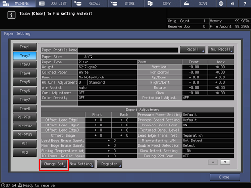 supplementary explanationFor Paper Size in the Change IndividualSet screen, only the automatically detected size can be specified. To specify the size directly, use the Reg./Del. Paper Set. screen. The Change IndividualSet screen does not allow you to delete a paper profile. To delete a paper profile, use the Reg./Del. Paper Set.screen. For details, refer to Adding/Editing the Paper Conditions Registration.