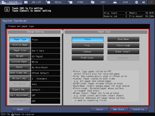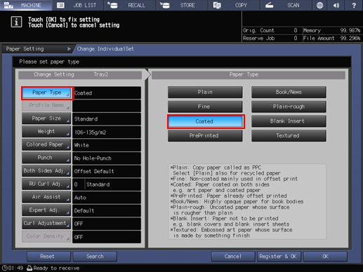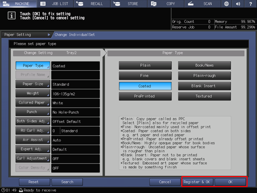 Check the settings, and press Register & OK; paper conditions are registered.