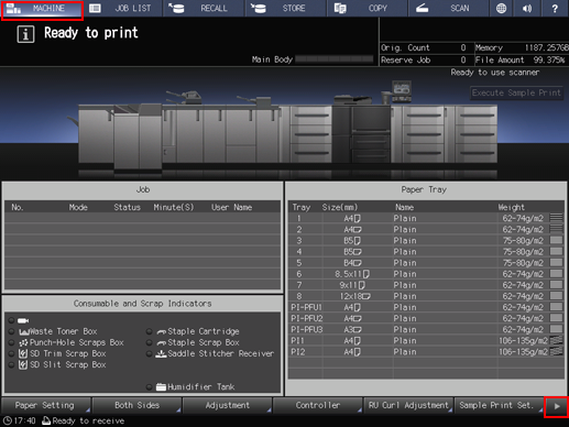On the touch panel of the main body, press Paper Setting on the MACHINE screen.