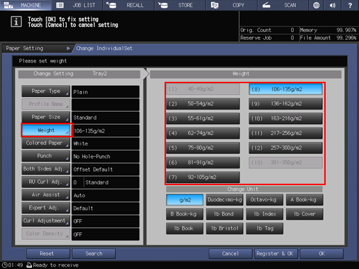 On the Change IndividualSet screen, press Weight. Press the desired paper weight in the right pane.