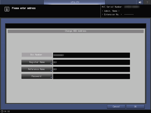 Control panel - Utility/Counter - [Scan Address Register] - [Address Edit] - [HDD] - [Change]