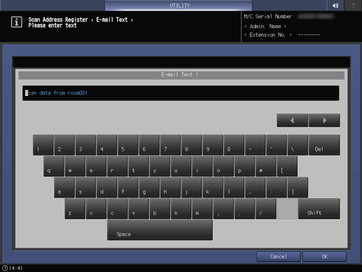 Control panel - Utility/Counter - [Administrator Setting] - [Scan Address Register] - [E-mail Text Setting] | |||