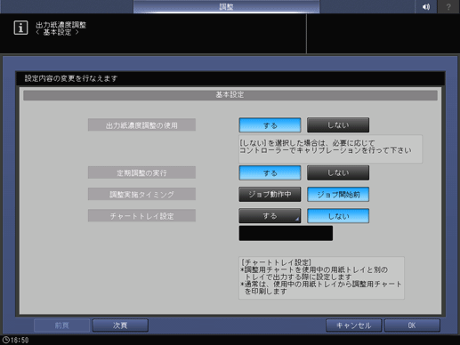 [出力紙濃度調整]の実行や調整タイミングなどの設定ができます。