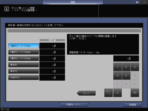 ステープル2箇所のとじ間隔およびコーナーステープルのとじ位置を調整します。