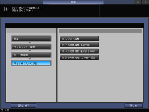 タッチパネル - [機械状態] - [調整] - [フィニッシャー調整] - [平とじ機調整] - [平とじ機(パンチ)調整]