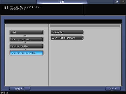 タッチパネル - [機械状態] - [調整] - [フィニッシャー調整] - [マルチ折り機調整] - [マルチ折り機(パンチ)調整]