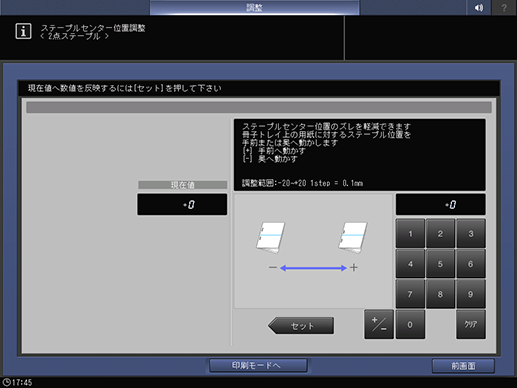 調整 > [中とじ機調整](中綴じ機 SD-513) > [ステープルセンター位置調整] > [2点ステープル]