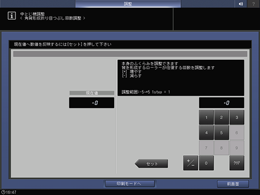 [+/-]で数値のプラスまたはマイナスを選択し、[セット]を押すと[現在値]を変更できます。