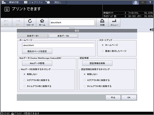 本機のタッチパネルのブラウザーに記憶された[ユーザー名]と[パスワード]を削除したい場合は、以下の手順で削除できます。