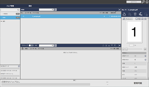 HDD保存ジョブの状態や情報を確認できるほか、印刷や削除、一時保存ジョブへの読出しなどの操作ができます。