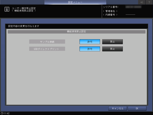 [サンプル排紙] | ユーザーによるサンプル排紙の使用を許可する設定をします。[禁止]に設定するとサンプル排紙ができなくなります。 サンプル排紙は、リアルタイムで出力画像の品質を確認できる機能です。詳しくは、[サンプル排紙設定]をごらんください。 |