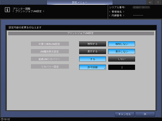 [リカバリー設定]*2 | [給紙JAMリカバリー]で[する]を選択した場合に設定します。 [許可回数]を押すと、自動で排紙して再印刷する回数を設定できます。 設定範囲:1 ~ 3 |