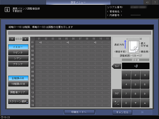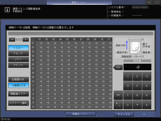 [16階調e32点]モード:通紙交差方向の32点、通紙方向の16点、合計512点の濃度調整値を手動で入力します。