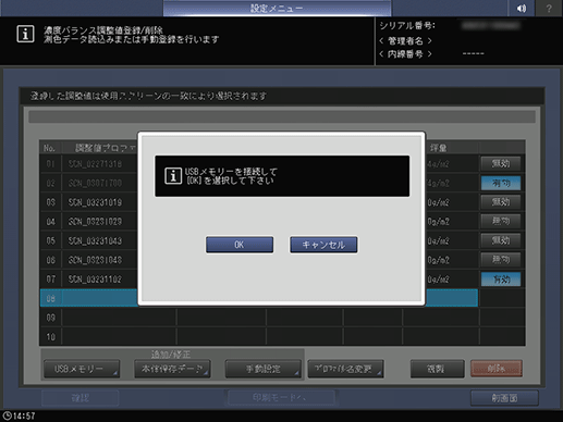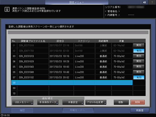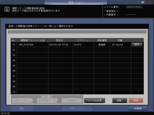 [調整値プロファイル名]は変更できます。詳しくは、[濃度バランス調整値登録/削除]をごらんください。
