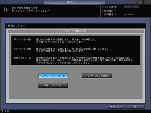 変更しようとしている濃度バランス調整値が測色器による測色データのとき、スクリーンは変更できません。[スクリーン選択]はグレーアウトして選択できません。