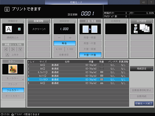 12 e 18 w、SRA3 w、13 e 19 w、11 e 17 wまたはA3 wのいずれかの用紙がセットされた給紙トレイを選択します。