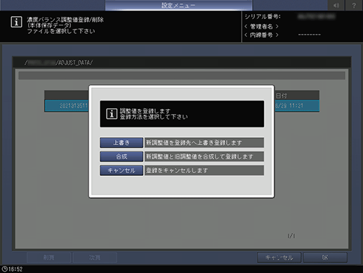 すでに登録されている番号を選択した場合は、登録済みの濃度バランス調整値が表示されます。