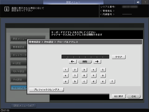 文字キー | 本機のIPv6グローバルアドレスを手動で設定します。 | |