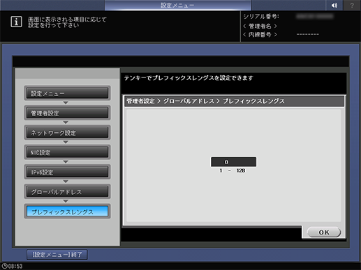 [プレフィックスレングス] | IPv6グローバルアドレスのプレフィックス長のビット数を設定します。 設定範囲:1 ~ 128 | |