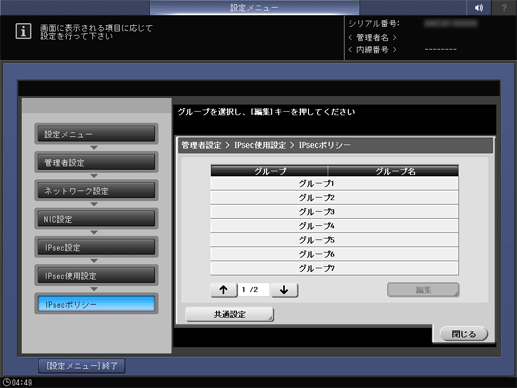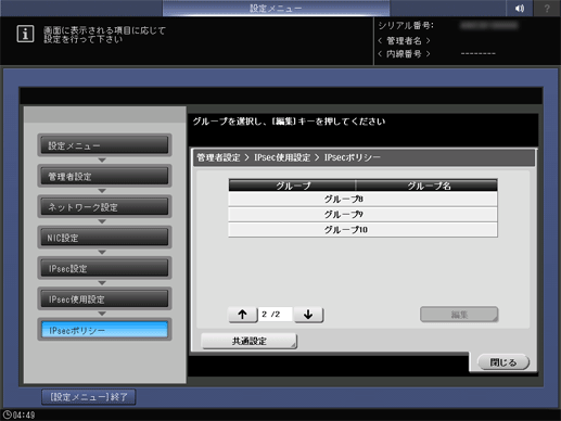操作パネル - 設定メニュー/カウンター - [管理者設定] - [ネットワーク設定] - [NIC設定] - [TCP/IP設定] - [IPsec設定] - [IPsec使用設定] - [IPsecポリシー]