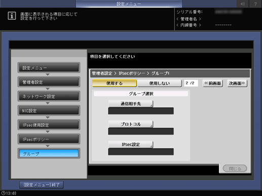 [使用しない] | 選択中の[グループ]をIPsecポリシーとして使用しません。 また、選択すると、選択中の[グループ]は削除されます。 | |