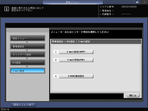 操作パネル - 設定メニュー/カウンター - [管理者設定] - [ネットワーク設定] - [NIC設定] - [E-mail設定]