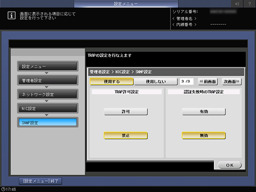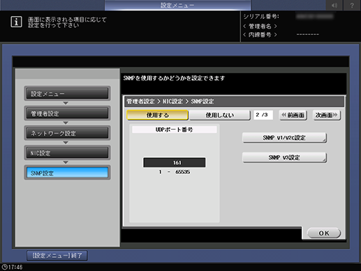操作パネル - 設定メニュー/カウンター - [管理者設定] - [ネットワーク設定] - [NIC設定] - [SNMP設定]