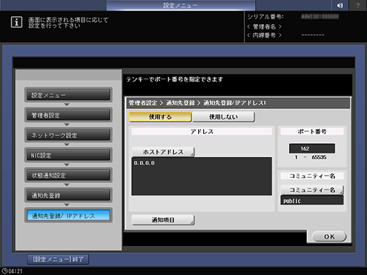操作パネルのテンキーでポート番号を入力します。設定範囲:1 ~ 65535