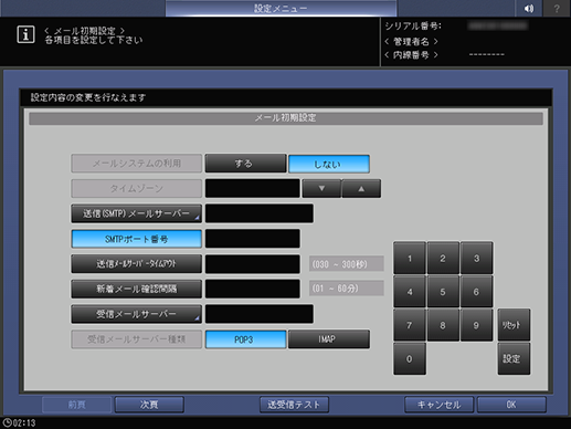 [POP3/IMAP ポート番号] | [受信メールサーバー種類]で設定したサーバーのポート番号を設定します。 画面のテンキーで入力します。 設定範囲:0 ~ 65535 | |