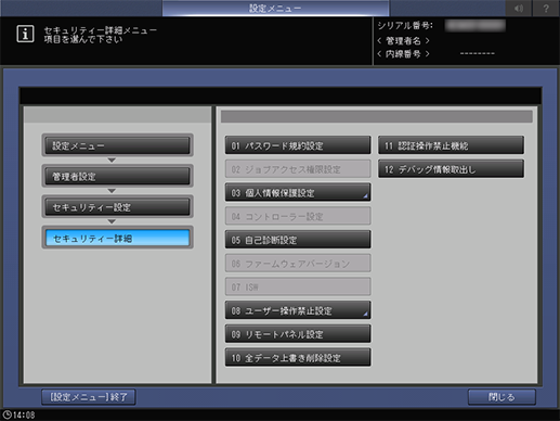 操作パネル - 設定メニュー/カウンター - [管理者設定] - [セキュリティー設定] - [セキュリティー詳細]