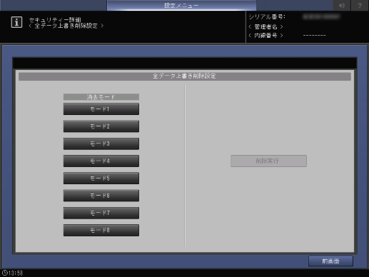 本機のHDDや不揮発メモリーのデータを、特定のデータで上書きして削除し、本機の全機能を無効にします。