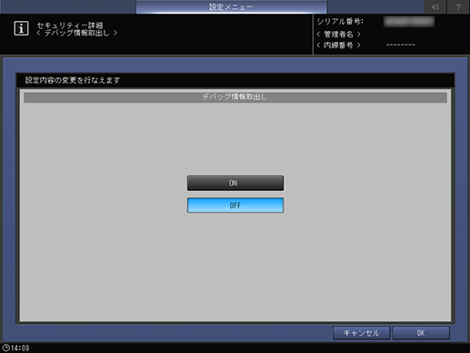 本機で問題が起きた場合に、サービスエンジニア(CE)による本機の情報(デバッグ情報)の取得をユーザー管理者が許可するかどうかを設定します。