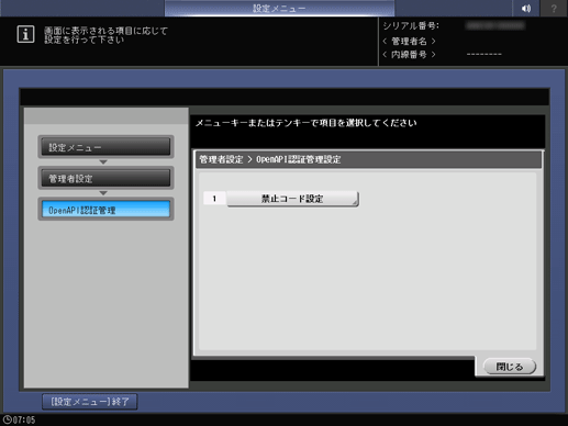 操作パネル - 設定メニュー/カウンター - [管理者設定] - [OpenAPI認証管理設定]
