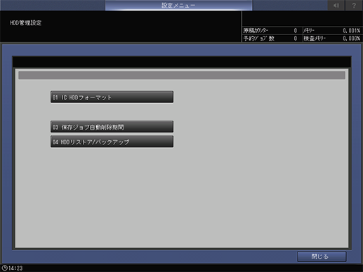 操作パネル - 設定メニュー/カウンター - [管理者設定] - [コントローラー設定] - [HDD管理設定]