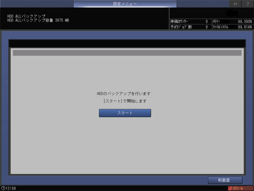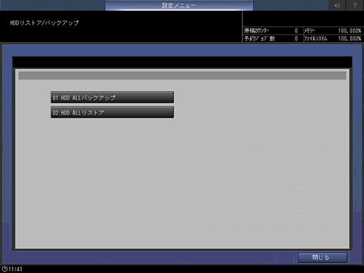 [HDD ALLリストア]は、[HDD ALLバックアップ]でバックアップしたデータをリストアします。HDDのデータがすべて上書きされ、消去されます。