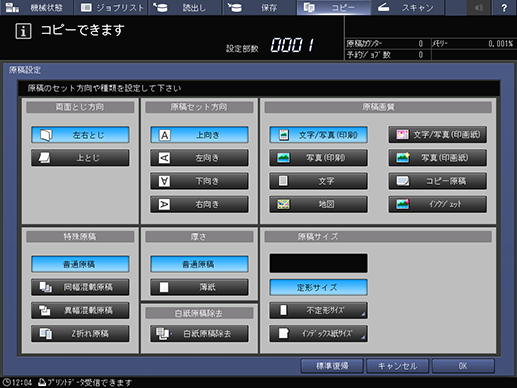 原稿のセット方向や画質のほか、両面原稿や薄紙原稿、異なるサイズが混ざった原稿を自動で読込む条件なども設定できます。