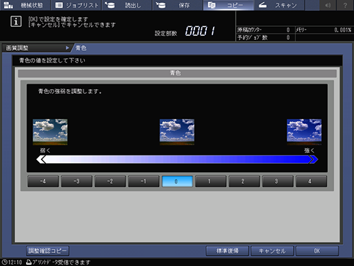 青色の強弱を設定します。[0]に対し、薄くするときは-(マイナス)側の、濃くするときは+(プラス)側のキーを押します。