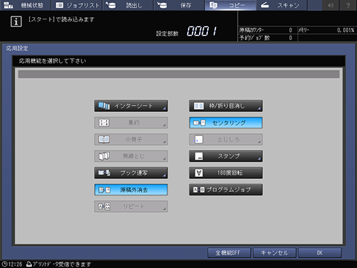[センタリング]を設定すると[等倍]と[原稿外消去]が自動で設定されます。[原稿外消去]は、ADFを使用するときは設定が解除されます。
