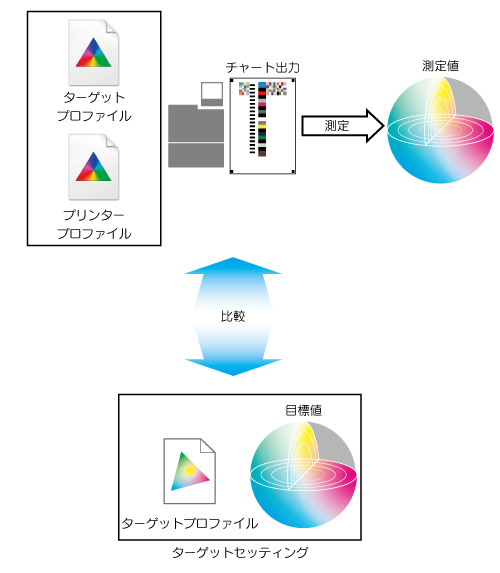 色検証とは、出力したチャートを測定し、実際の出力結果(測定値)と設定した目安(目標値)とを比較する機能です。