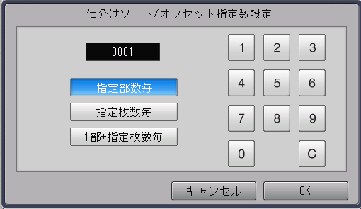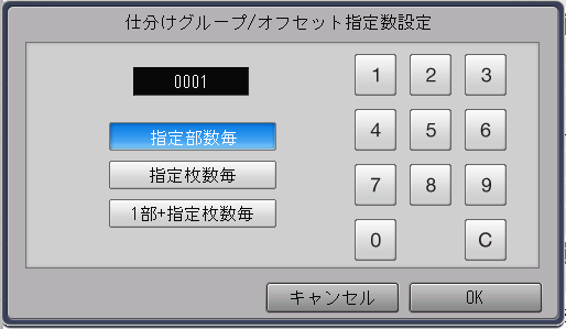[仕分けグループ] | 原稿1枚ごとに設定数分の印刷をして、原稿ごとに区切って出力(オフセット出力)します。オフセットする部数や枚数を設定できます。 |