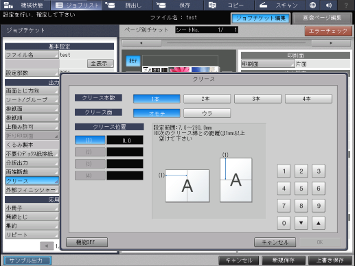 [クリース本数] | [1本]、[2本]、[3本]、[4本] | クリースの本数を設定します。 用紙の長さ(長手方向の長さ)によって設定できるクリースの位置が異なります。 | |
