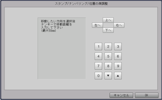 [印字位置設定] | [位置の微調整] | 数値を入力して、スタンプを印字する位置を設定します。 [印字位置設定]表示の9枠のいずれかを印字位置として選択してから、[位置の微調整]で位置の調整をします。 |