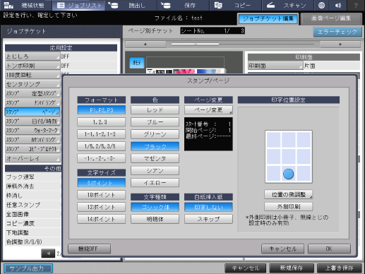 ページスタンプのスタート番号や開始ページ、最終ページを設定します。