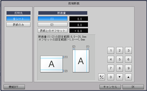 両端断裁の[断裁量]と[表紙とのオフセット]を設定します。