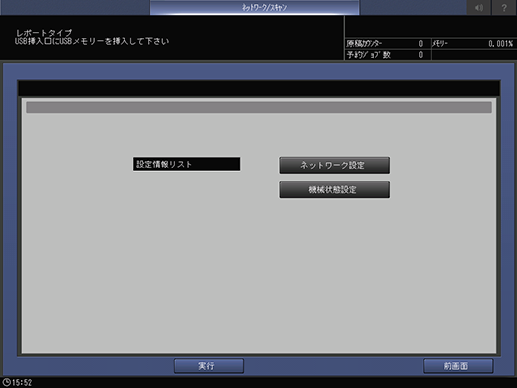 [ネットワーク設定] | 本機のTCP/IP設定など、ネットワークに関する設定情報をUSBメモリーに保存します。本機を管理するうえで、ネットワーク設定に関する情報を把握するのに役立ちます。 |