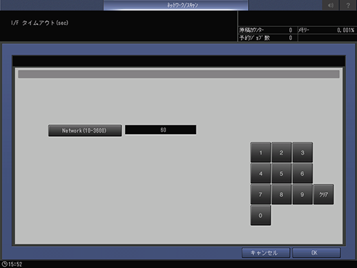 テンキー | 数値を入力します。 [Network(10-3600)] 設定範囲:10秒 ~ 3,600秒 |