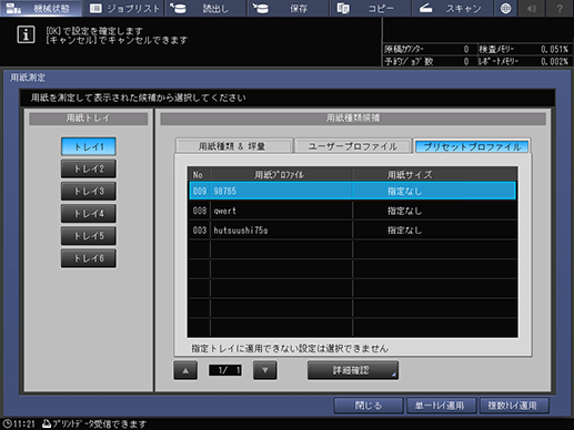 タッチパネル - [機械状態] - [用紙測定] - [プリセットプロファイル]