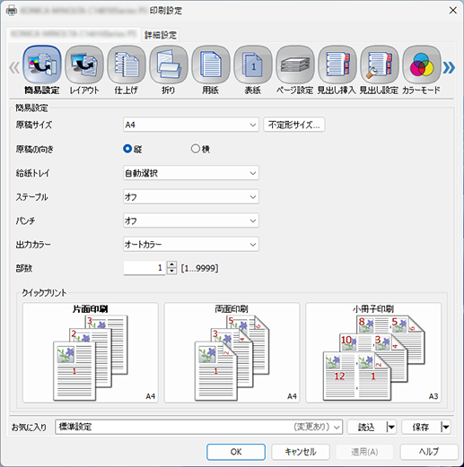 ジョブの印刷設定を編集します。画面上部のタブを選択すると、該当の設定画面が表示されます。設定した内容を適用して印刷したり、設定をお気に入りとして登録したりできます。