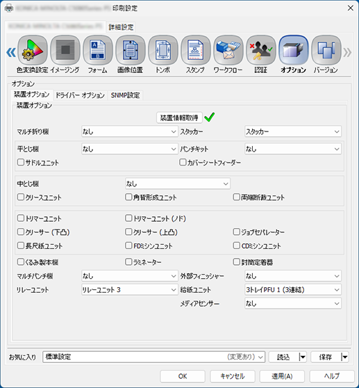 装置情報を取得すると、本機のオプション装着状態が自動で更新されます。