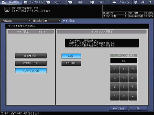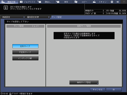 [定形サイズ]、[不定形サイズ]または[インデックス紙]から設定したい用紙サイズを選択します。
